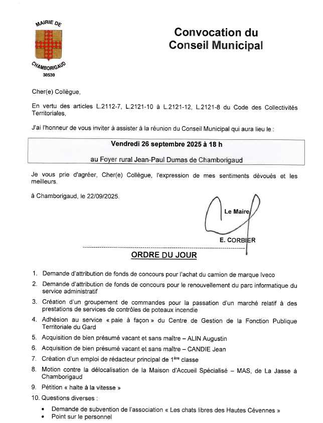 Prochain Conseil Municipal 9/22/25 Le prochain Conseil Municipal aura lieu vendredi 26 septembre 2025 à 18 h.